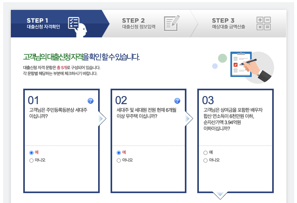 다음 5개의 문항에 대해 해당사항을 체크하면 됩니다. 세대주 여부, 무주택 기간, 소득 등을 바탕으로 대출 자격을 확인하게 됩니다. 질문은 다음과 같습니다.