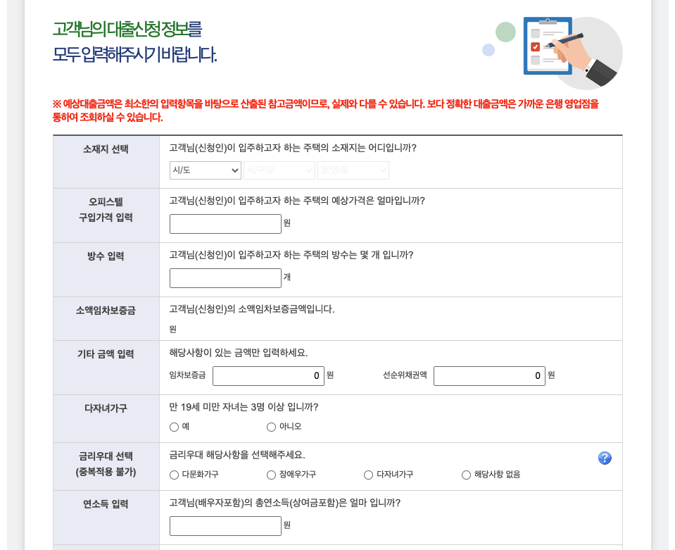 ※ 예상대출금액은 최소한의 입력항목을 바탕으로 산출된 참고금액이므로, 실제와 다를 수 있습니다. 보다 정확한 대출금액은 가까운 은행 영업점을 통하여 조회하실 수 있습니다.