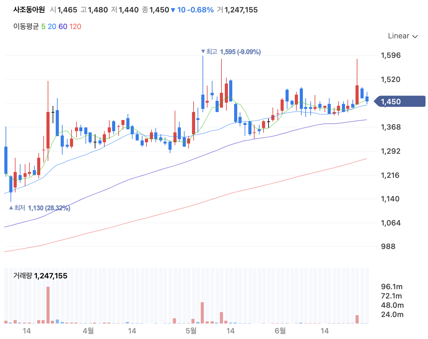 2020년 3월 이후 안정적으로 우상향을 그려왔고, 23일에 장대양봉이 나왔습니다. 다른 유승민 관련주와는 다르게 올린 주가를 지지해주고 있다는 점입니다. 5월 하락 이후에 쌍바닥을 만들고 상승하면서, 23일 장대양봉이 60일선과 20일선을 뚫고 상승한 그림을 그렸습니다. 25일 긴 윗꼬리를 만들어서 주의해야할 것으로 보입니다.