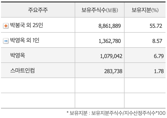 인상적인 점은 주요주주에서 '주식농부'로 유명한 슈퍼개미 박영옥 스마트인컴 대표가 8.57%의 지분을 가지고 있는 점입니다.