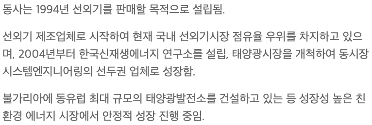 국내 선외기 시장에서 2020년 매출 기준으로 33%의 시장 점유율을 차지하면서 1위 자리를 굳히고 있습니다. 또한 태양광 사업에서 두각을 나타내고 있습니다.