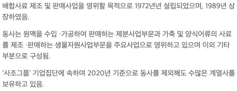 참치캔으로 유명한 사조그룹에 속해있고, 제분과 생물자원 부문 상업을 영위하고 있습니다.