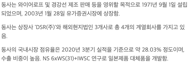 중간산업재로 쓰이는 선재를 가공하여 와이어로프, 경강선을 제조하고 있습니다. 자동차, 광산, 기계, 선박, 건설, 조선 등 다양한 범위에서 쓰이는 만큼, 경기민감주로 분류할 수 있을 것 같습니다.