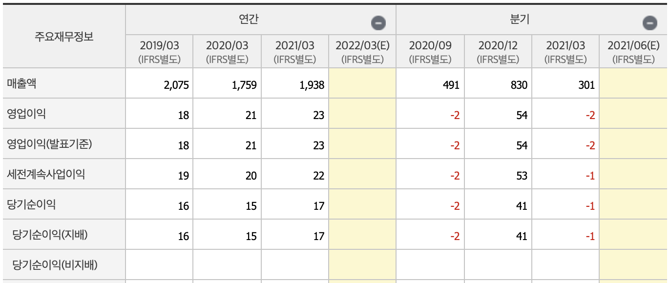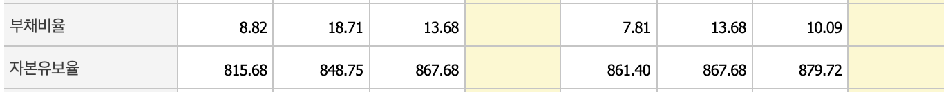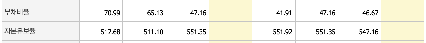 매출은 지지부진하지만 부채비율과 자본유보율 면에서는 안정적인 모습입니다.