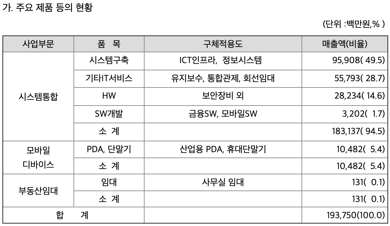대신정보통신은 ICT 인프라, 정보시스템 구축을 기반으로 시스템 통합 사업부문이 전체 매출의 94%를 차지하고 있습니다.