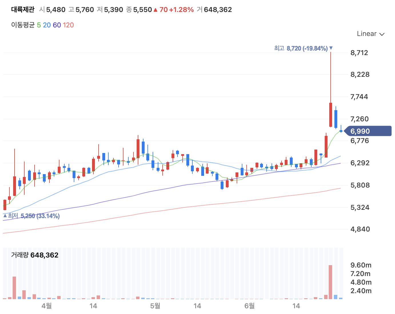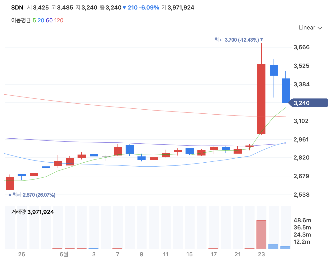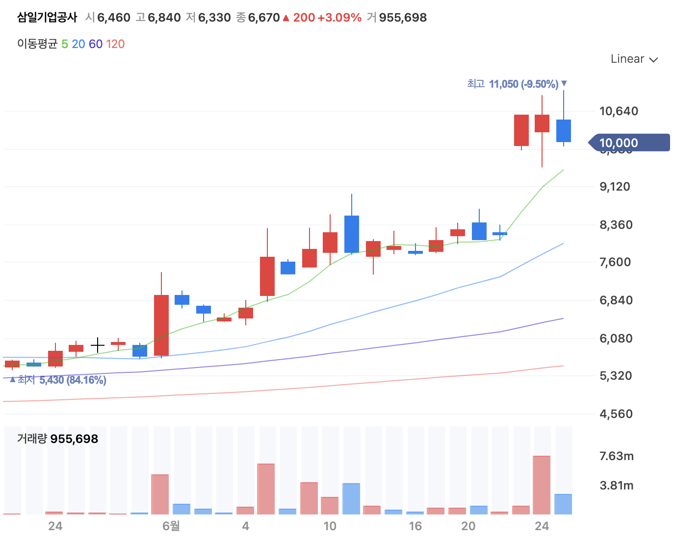 2020년 3월 이후 안정적으로 우상향을 그려왔고, 23일에 장대양봉이 나왔습니다. 다른 유승민 관련주와는 다르게 올린 주가를 지지해주고 있다는 점입니다. 5월 하락 이후에 쌍바닥을 만들고 상승하면서, 23일 장대양봉이 60일선과 20일선을 뚫고 상승한 그림을 그렸습니다. 25일 긴 윗꼬리를 만들어서 주의해야할 것으로 보입니다.