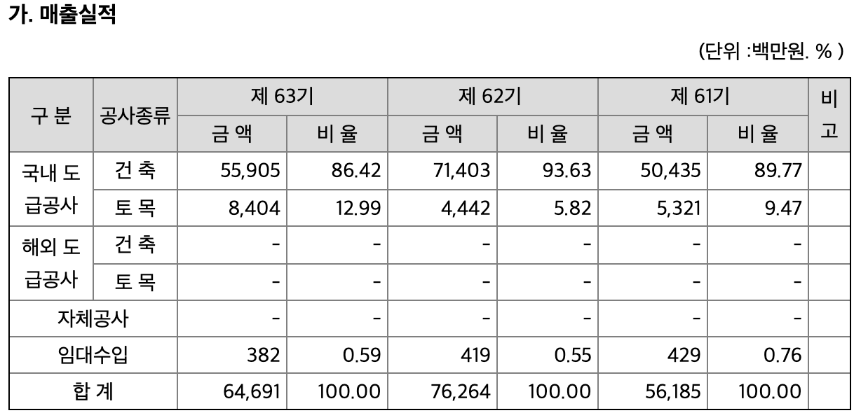 국내도급공사만 진행하는 내수기업으로 건축공사의 매출 비율이 75%가량을 차지하고 있습니다.
