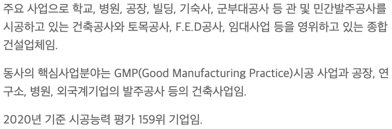 국내 건축도급공사가 사업의 90%정도를 차지하고, 국내 토목공사가 10%정도를 차지하는 내수기업입니다.