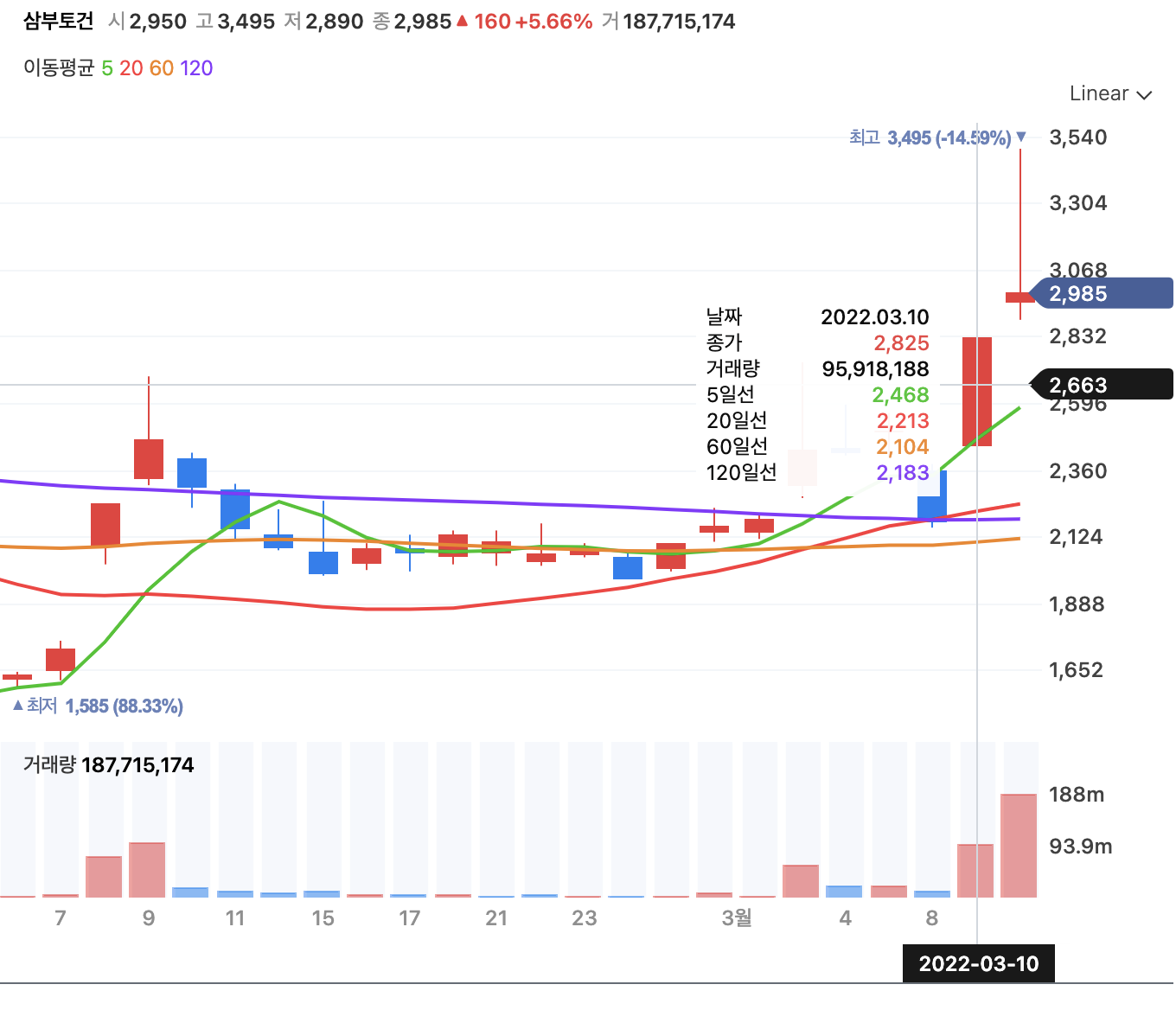 대선 직후 3월 10일, 11일 삼부토건의 주가가 요동친 것을 확인할 수 있습니다. 시장은 거짓말을 하지 않죠.