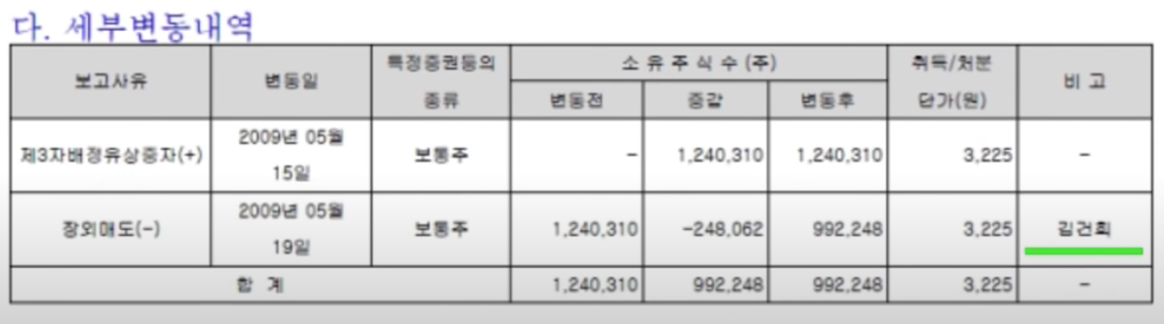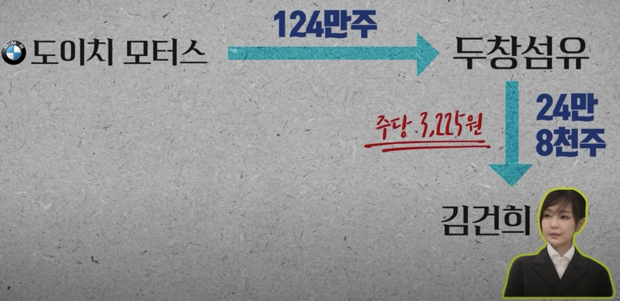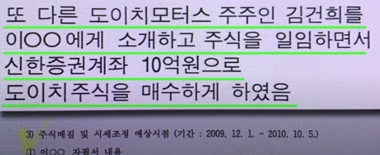 김건희씨가 24만 8천 62주를 매수해서 대주주가 되죠. 김건희씨는 장내매수를 한 것이 아닌 장외매수를 했는대요. 도이치모터스에서 두창섬유로 124만주를 유상증자 형태로 신규발행하고, 이 주식에서 두창섬유가 24만주 가량을 김건희씨에게 매도합니다. 당시 장내 주가는 한주에 3600원 선이었는데, 김건희씨에게는 3225원에 넘깁니다. 장외에서 장내 금액보다 적은 금액에 주식을 매도하는 것은 주주에게 손해를 끼치는 행위죠. 그래도 불법은 아닙니다. 문제는 이후입니다.