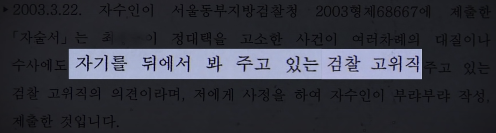 백씨는 자수서에서 최 회장이 '자기를 뒤에서 봐 주고 있는 검찰 고위직'이 있다는 발언을 했다고 작성합니다. 그리고 여기서 취재진이 추정하는 '검찰 고위직' 인물은 양 모 전 차장검사입니다.