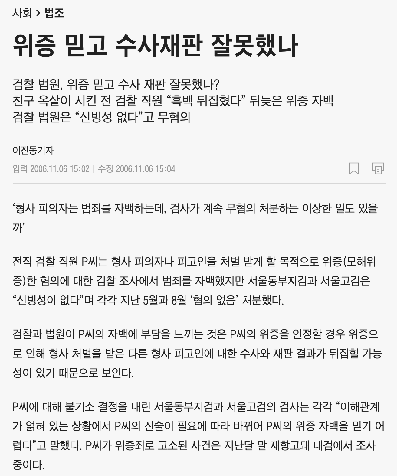 위증 믿고 수사재판 잘못했나 검찰 법원, 위증 믿고 수사 재판 잘못했나 친구 옥살이 시킨 전 검찰 직원 흑백 뒤집혔다 뒤늦은 위증 자백 검찰 법원은 신빙성 없다고 무혐의