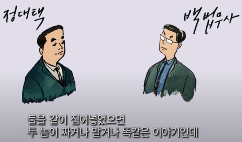 바로 최회장이 약속했던 대가였던 13억원(정대택씨랑 나눠야 했던 26억원의 절반)이 아니라 수표 2억원과 3억원짜리 아파트, 총 5억원에 끝내려고 했기 때문입니다. 정대택씨와 고향 친구사이였던 백 법무사는 친구를 배신한 양심의 가책(정대택씨를 몇번이고 찾아가 무릎꿇고 용서를 빌었다고 하죠.)과 약속했던 대가를 못 받게 된 것에 분노해서 자백을 하게 된 겁니다.