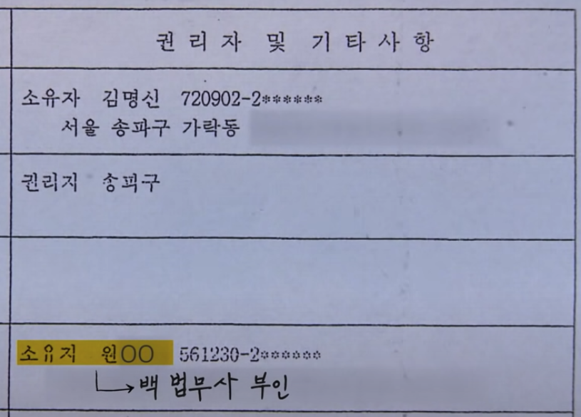 그러나 항소심에서 반전이 일어납니다. 백 법무사가 1심에서 위증했다고 자백을 합니다. 자백의 내용은 1심의 증언에는 수표 총 2억원과 송파구 가락동에 위치한 3억원짜리 아파트를 받은 대가로 이루어졌다는 것입니다. 그리고 여기서 가락동 아파트는 '김명신'에서 백 법무사의 아내 원모씨에게 이전됩니다.