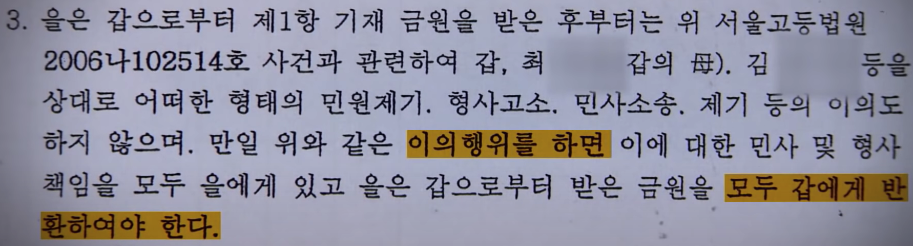 이때 이 소문을 듣고 나타난 사람이 최회장입니다. 그리고 이들은 5달만에 52억원을 남기게되죠. 이익금은 반반 나누기로 약정서를 작성한 상태였습니다. 둘이 사이좋게 26억씩 나눠가지면 해피엔딩이 될 수 있었는데, 최회장의 태도가 돌변합니다. 최회장이 약정이 협박과 강요에 이루어진 것이라고 '형사소송'을 진행합니다.