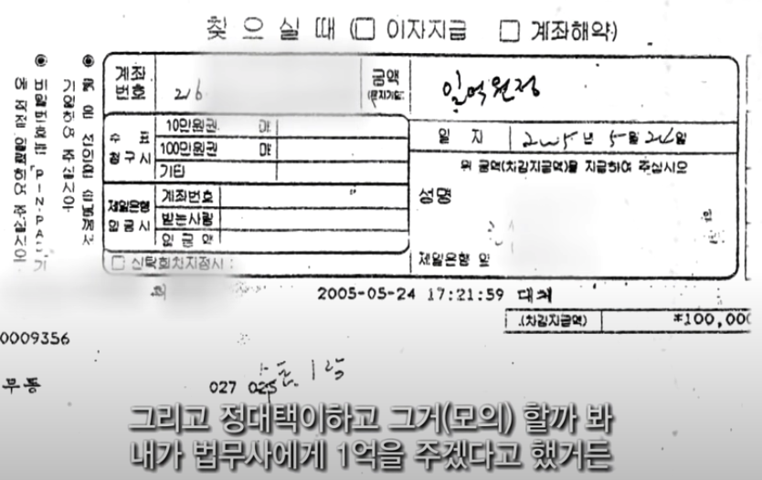 바로 최회장이 약속했던 대가였던 13억원(정대택씨랑 나눠야 했던 26억원의 절반)이 아니라 수표 2억원과 3억원짜리 아파트, 총 5억원에 끝내려고 했기 때문입니다. 정대택씨와 고향 친구사이였던 백 법무사는 친구를 배신한 양심의 가책(정대택씨를 몇번이고 찾아가 무릎꿇고 용서를 빌었다고 하죠.)과 약속했던 대가를 못 받게 된 것에 분노해서 자백을 하게 된 겁니다.