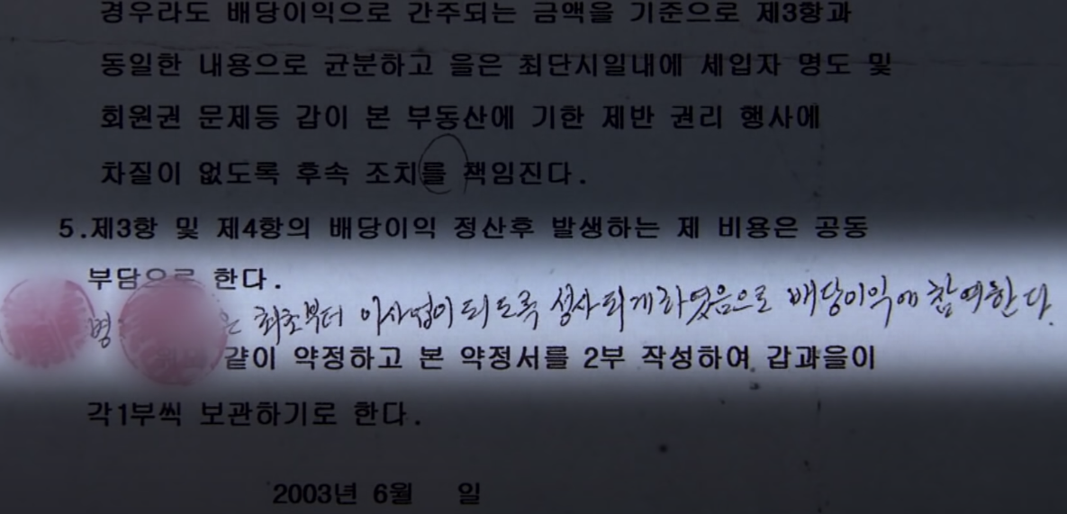 상식적으로 최회장이 강요를 받아 약정서가 체결되는 자리에서 최회장의 동업자로 입회한 김씨가 자기 배당을 달라는 내용을 약정서에 쓸 수 있었겠냐는 겁니다.