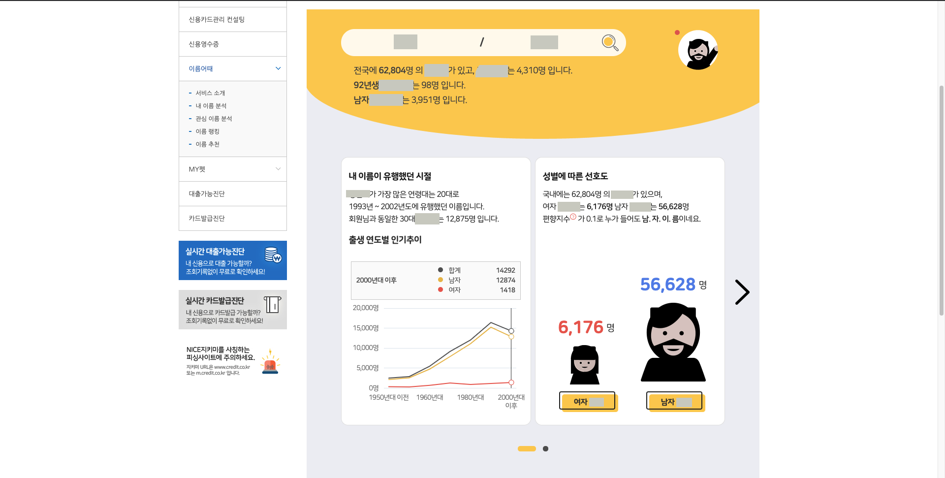 제 이름을 확인해보니 전국에 62,804명이 있고, 같은 년생과, 성별은 몇명이 있는지도 나옵니다. 1993년~2002년 사이에 가장 유행했던 이름이라고 하네요!
