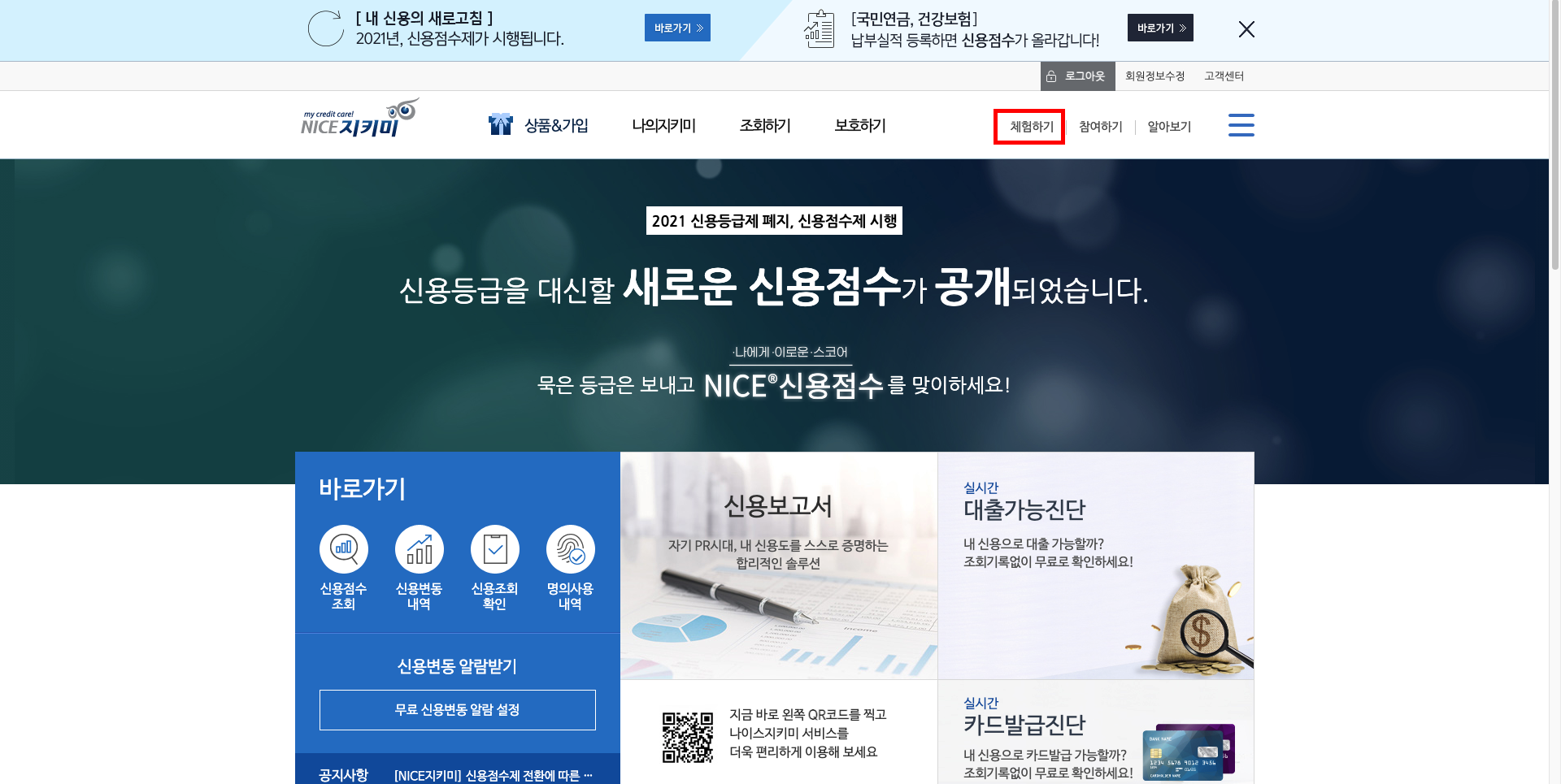 나이스지키미 홈페이지에 들어가시면 상단 메뉴에 체험하기가 있습니다. 여기를 클릭해주세요. 서비스를 이용하시려면 회원가입을 해야합니다.