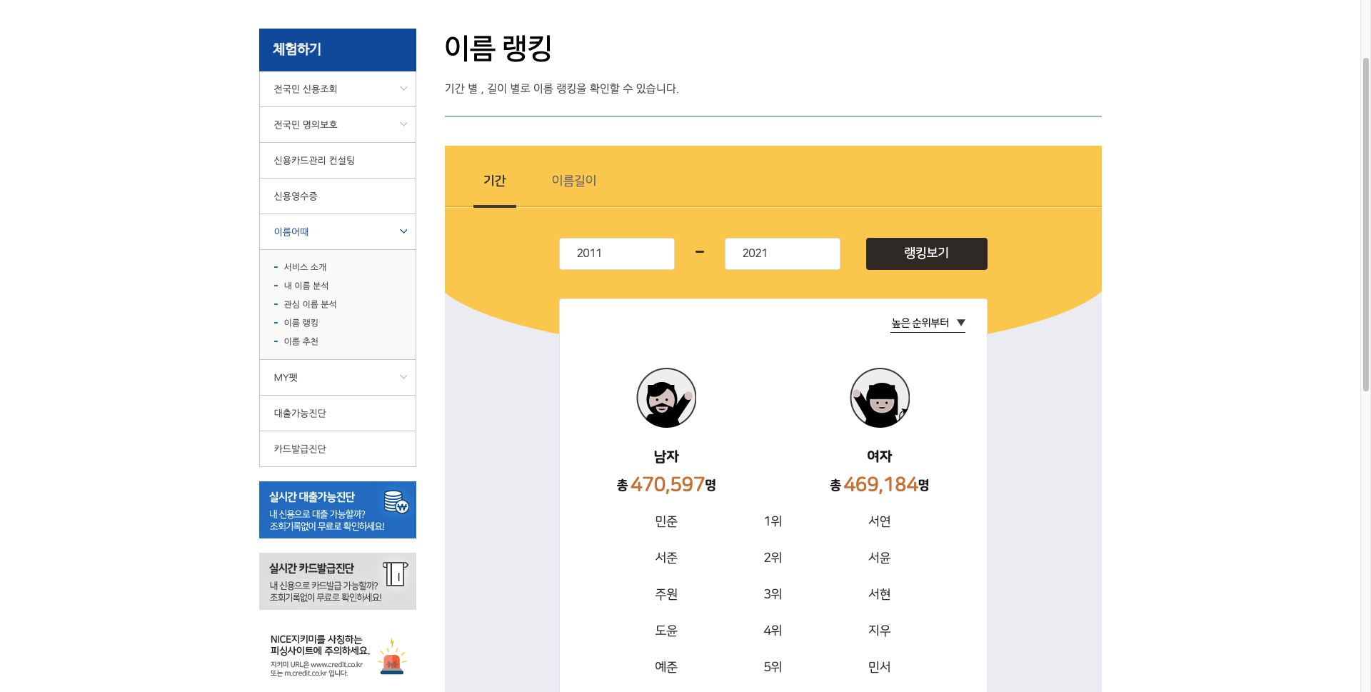 그 다음 [이름 랭킹]을 확인해봤습니다. 2011년부터 2021년까지 남자와 여자의 이름랭킹을 확인해 봤는대요,