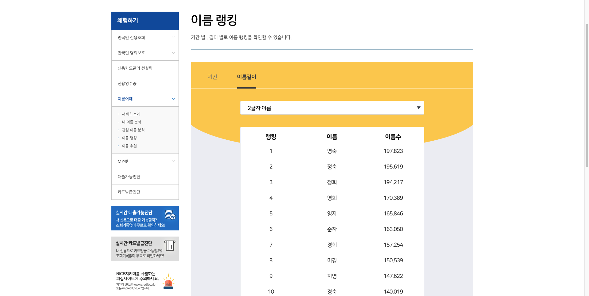 또한 1글자 이름, 2글자, 3글자 이름 이런식으로 이름길이로 랭킹을 확인해 볼 수 있습니다.