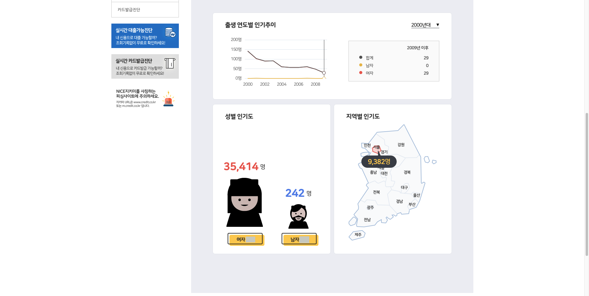 내 이름 분석을 누르면 아래와 같이 성별에 따른 통계 분석이 나옵니다.