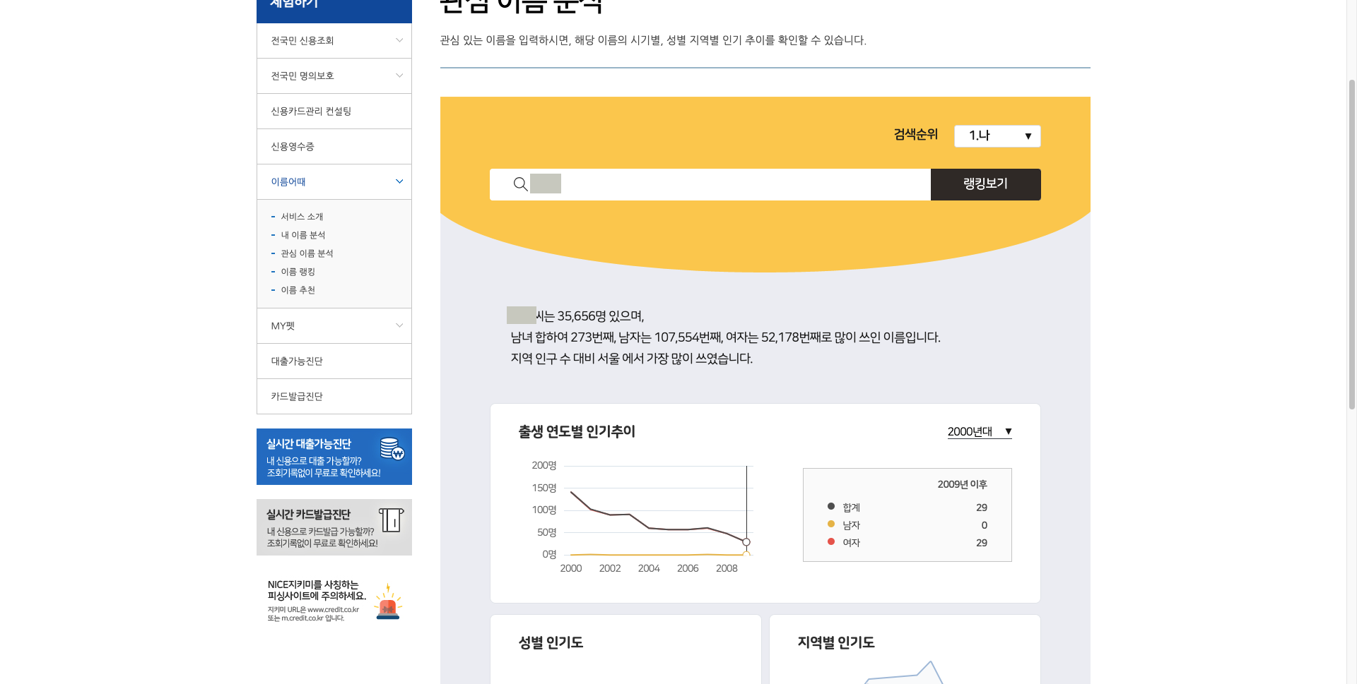 그 다음으로 [관심 이름 분석]을 해봤습니다. 제가 검색한 이름에 대한 통계, 성별 인기도, 지역별 인기도, 인기추이 등 꽤 구체적인 데이터를 확인할 수 있습니다. [관심 이름 분석]은 성을 뺀 이름만 적으셔야해요!