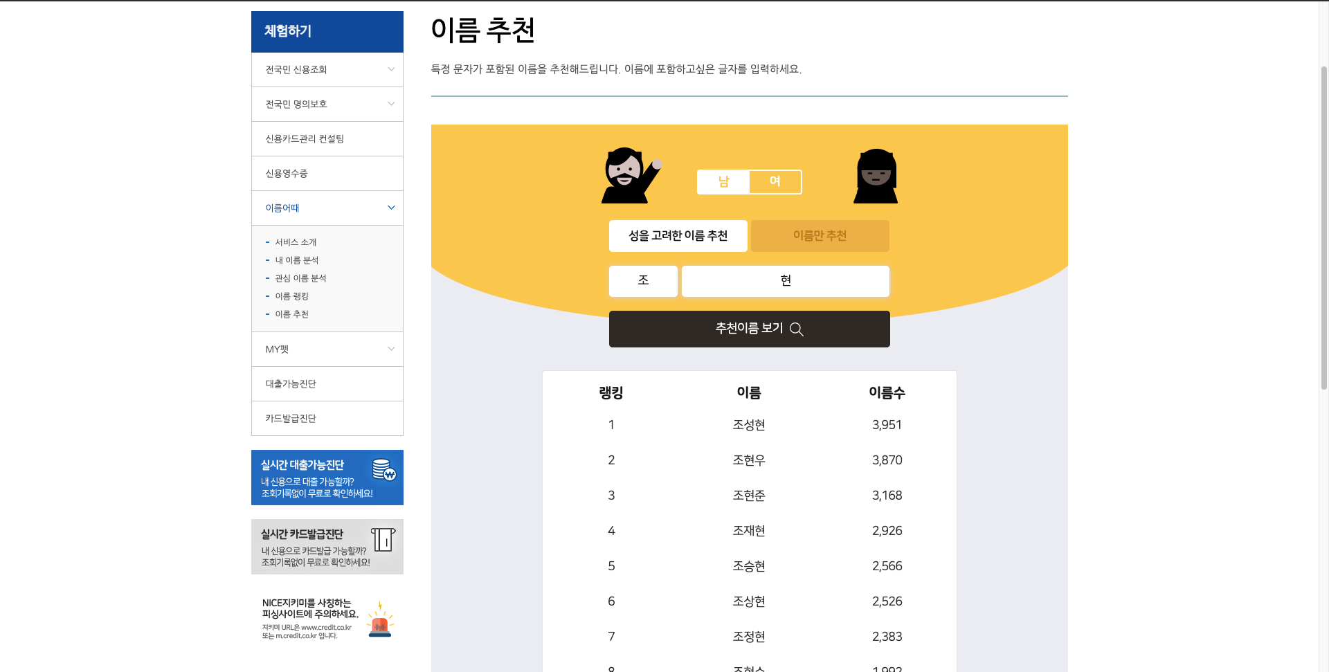 다음으로 [이름 추천]을 해봤습니다. 성을 조로 하고 이름에 들어갈 글자를 현으로 해보니, 조성현, 조현우, 조현준 등등 많이 들어본 이름부터 순서대로 나오는 것을 확인할 수 있습니다.