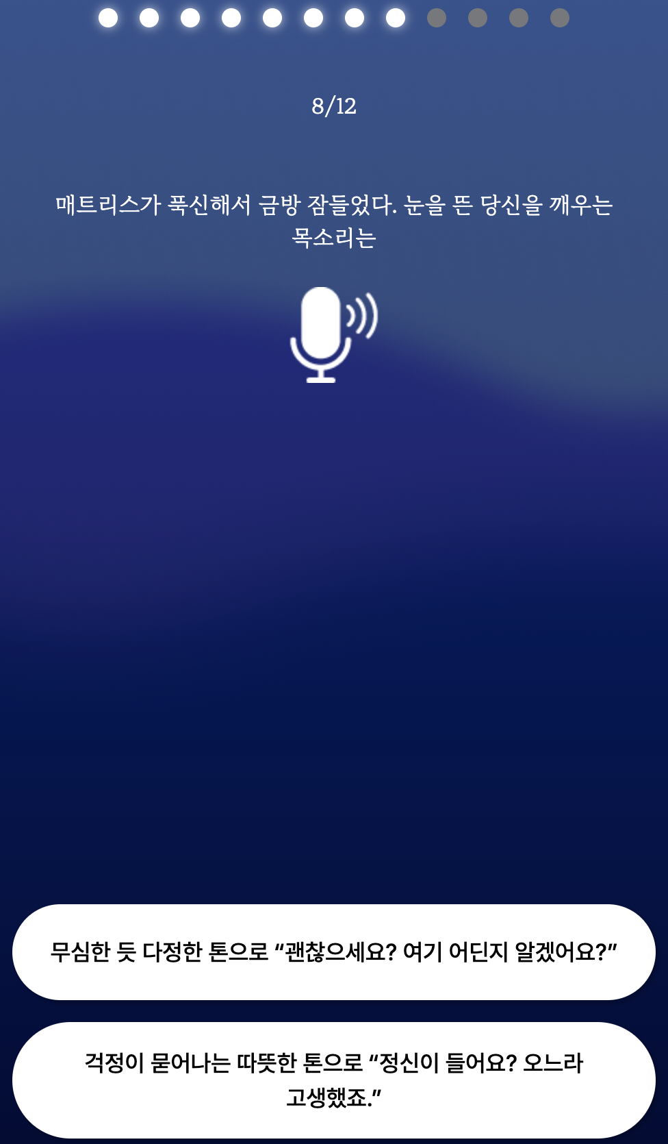 Q8. 매트리스가 푹신해서 금방 잠들었다. 눈을 뜬 당신을 깨우는 목소리는?
