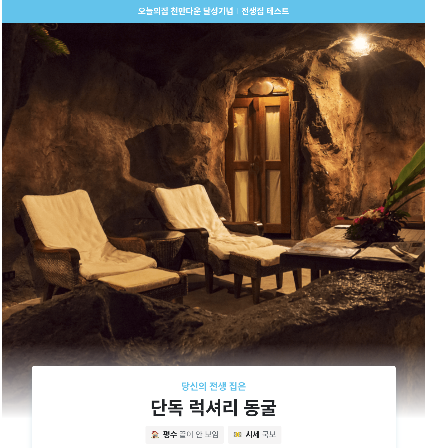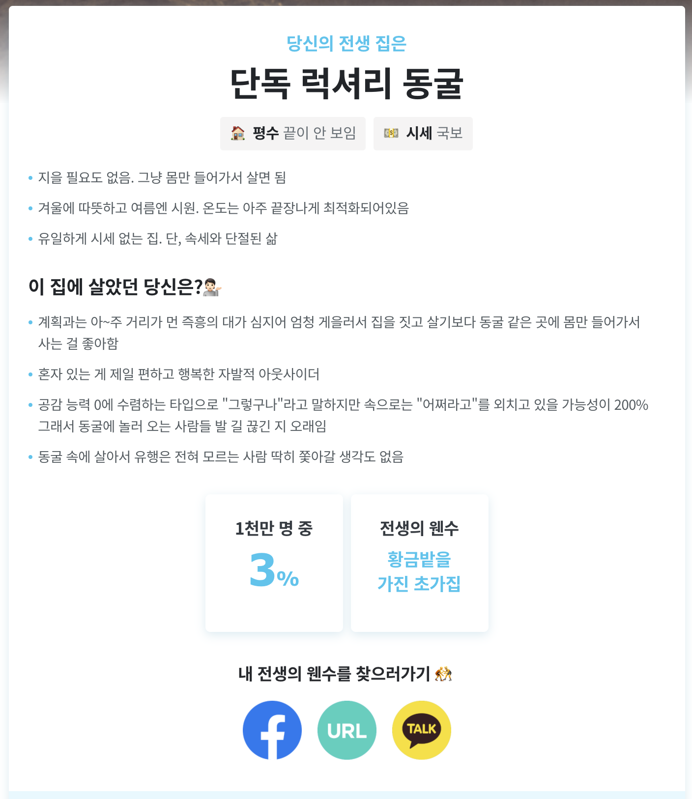 제 전생 집은 '단독 럭셔리 동굴'이 나왔습니다. 럭셔리와 동굴이라.. 뭔가 모순된 단어인 것 같은데..