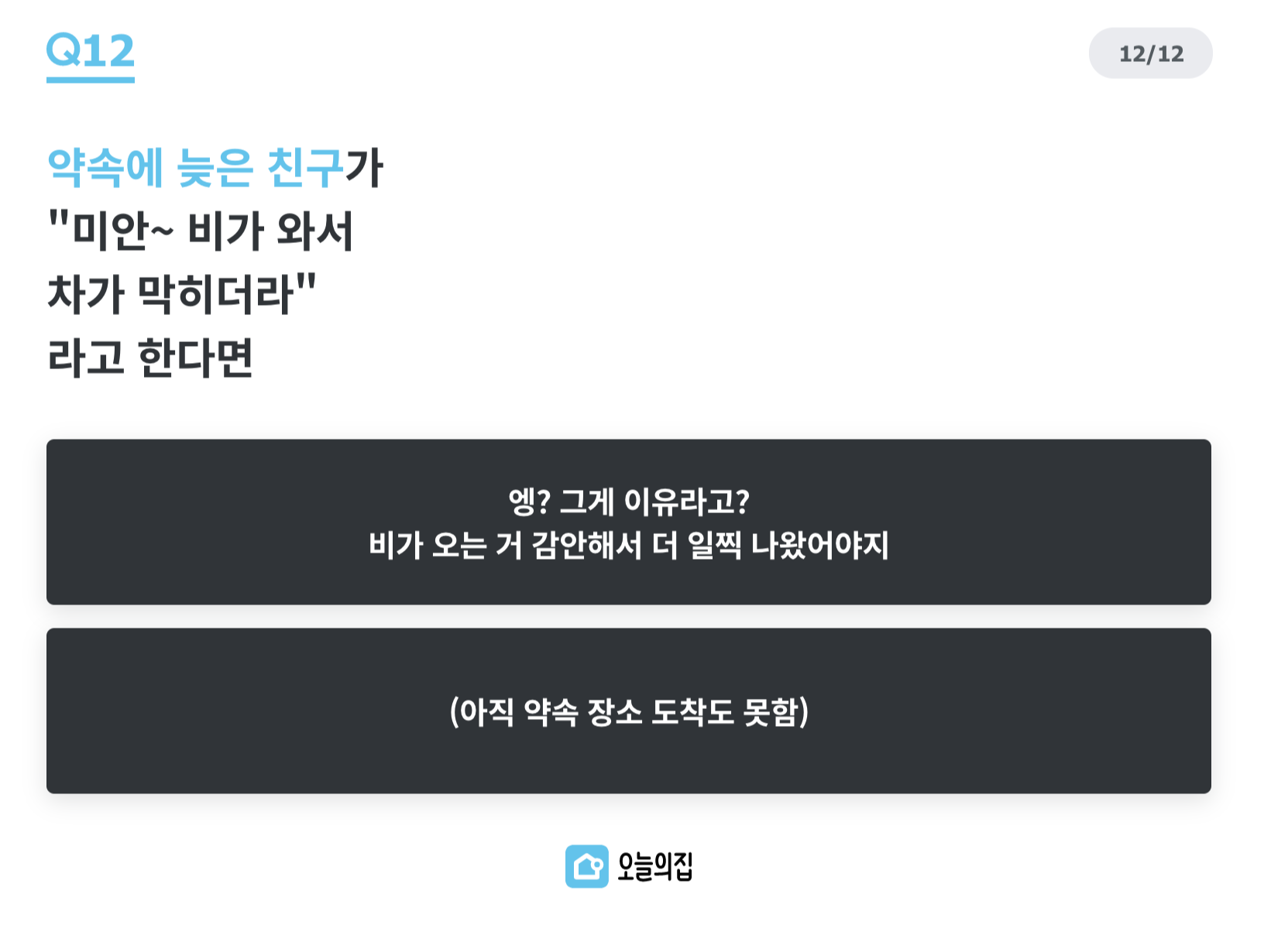 Q12. 약속에 늦은 친구가 "미안~ 비가 와서 차가 막히더라" 라고 한다면