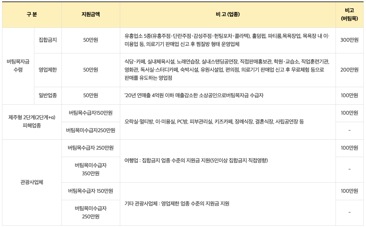 - 버팀목자금(정부지원금) 일반업종으로 지원받은 업체, 단 여행업종 및 관광사업체는 제외
