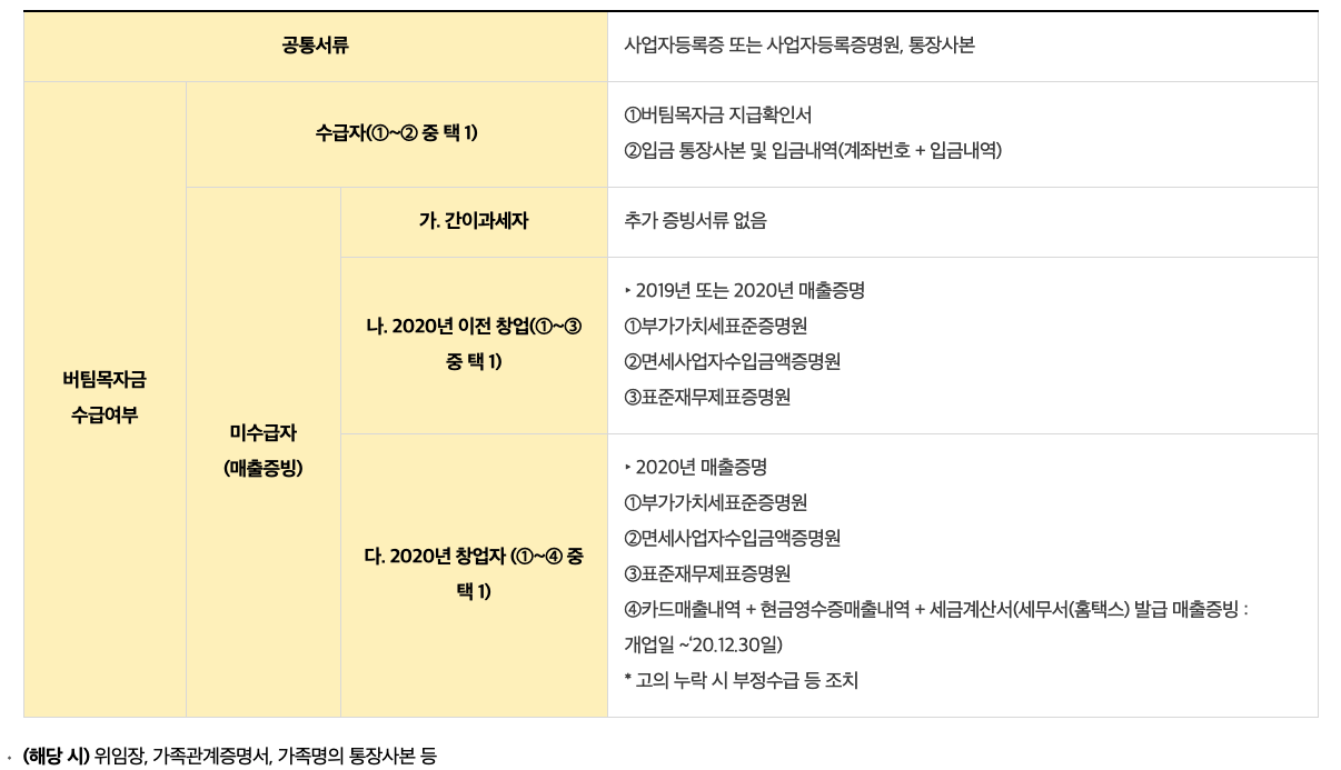 1) 버팀목자금 수급자 : 버팀목자금 지급확인서 또는 계좌입금내역
