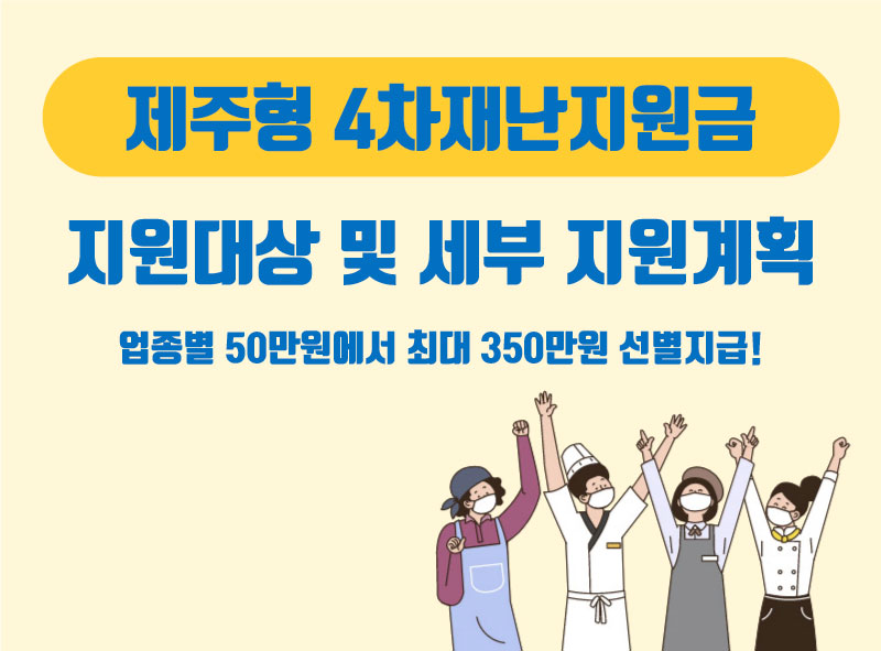 정부의 4차 재난지원금이 논의되고 있는 시점입니다. 문재인 대통령은 4차 재난지원금 대상과 규모를 "최대한 넓고 두텁게" 지원할 것으로 밝혔습니다. 제주도는 지자체에서 자체적으로 소상공인을 대상으로한 4차 재난지원금 지원을 시작했습니다. 2월 1일부터 접수가 시작되어 3월 31일까지 접수를 받고 있습니다. 업종별로 50만원에서 350만원을 선별지급하고 있습니다. 특히 여행수요가 많던 제주도라서 관광사업체를 특별지원대상으로 지원하고 있습니다. 세부적인 지원 내용을 안내해드릴게요!