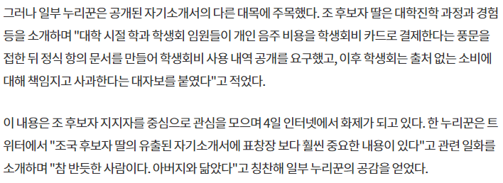 여러 허위 스펙 의혹이 제기되는 가운데 친문 성향의 네티즌들 사이에서 기자들이 언급하지 않는 진정한 스펙이자 미담이라고 칭송받는 자소서 구절이 부각되었다. 그것은 조민이 고려대 재학 당시 학내 학생회비 부정사용에 문제를 제기했고 그 결과 학생회의 대자보 사과를 이끌어냈다는 구절이었다. 그러나 이 구절이 주목받자마자 진상에 대한 관심이 증폭했는데, 기사에 따르면 당시 학생회 조사 결과 학생회비 부정사용은 존재하지 않았으며 대자보를 통한 사과문은 없었다. 조민은 서울대 환경대학원 지원 자소서에 학내 비리를 항의하여 사과를 받아낸것처럼 포장하여 자신의 도덕성을 강조하는데 사용하였다.