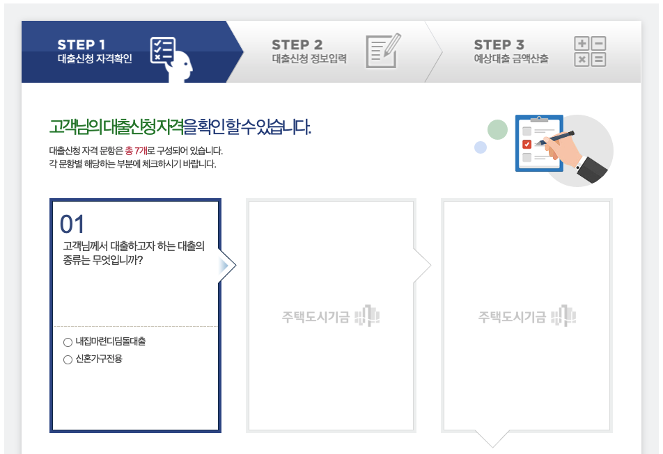 STEP 1. 대출신청 자격확인 - STEP 2. 대출신청 정보입력 - STEP 3. 예상대출 금액산출의 단계를 따라가면 누구나 쉽게 주택 전세 자금 한도를 조회해 보실 수 있습니다. 그럼 하나하나 따라가볼게요!