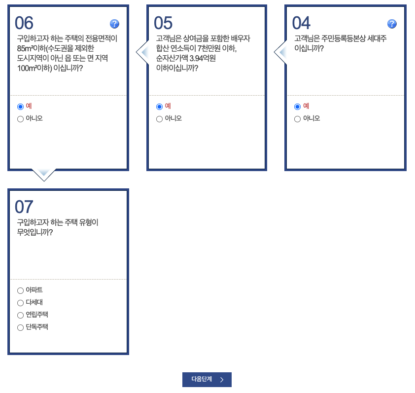 위의 연소득, 부채, 자산정보, 소재지, 주택가격, 희망대출금액 등을 모두 입력 하셨으면 하단의 다음단계 버튼을 눌러 게속 진행합니다.