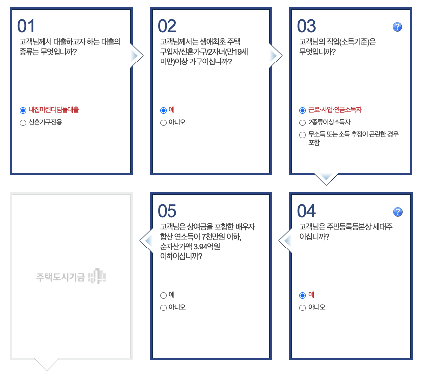 다음 7개의 문항에 대해 해당사항을 체크하면 됩니다. 대출 종류, 직업, 세대주 여부 등을 바탕으로 대출 자격을 확인하게 됩니다. 질문은 다음과 같습니다.