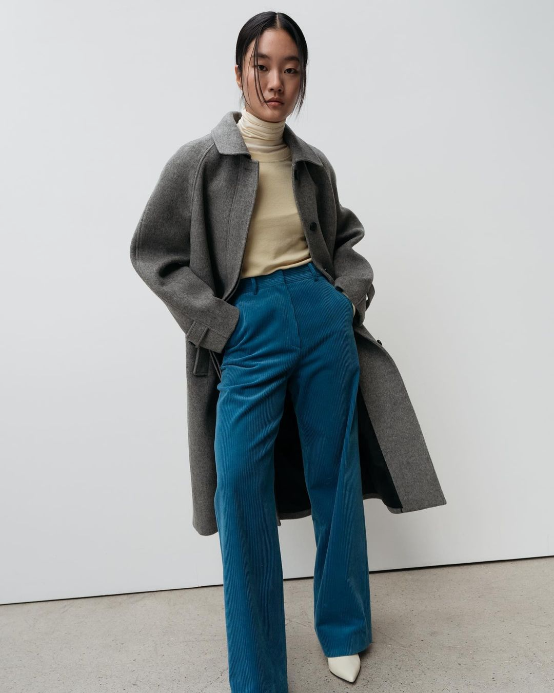 라임 컬러 폴라티에 그레이 레글런 코트+와이드 팬츠와 레이스업 슈즈 매치했어요.
