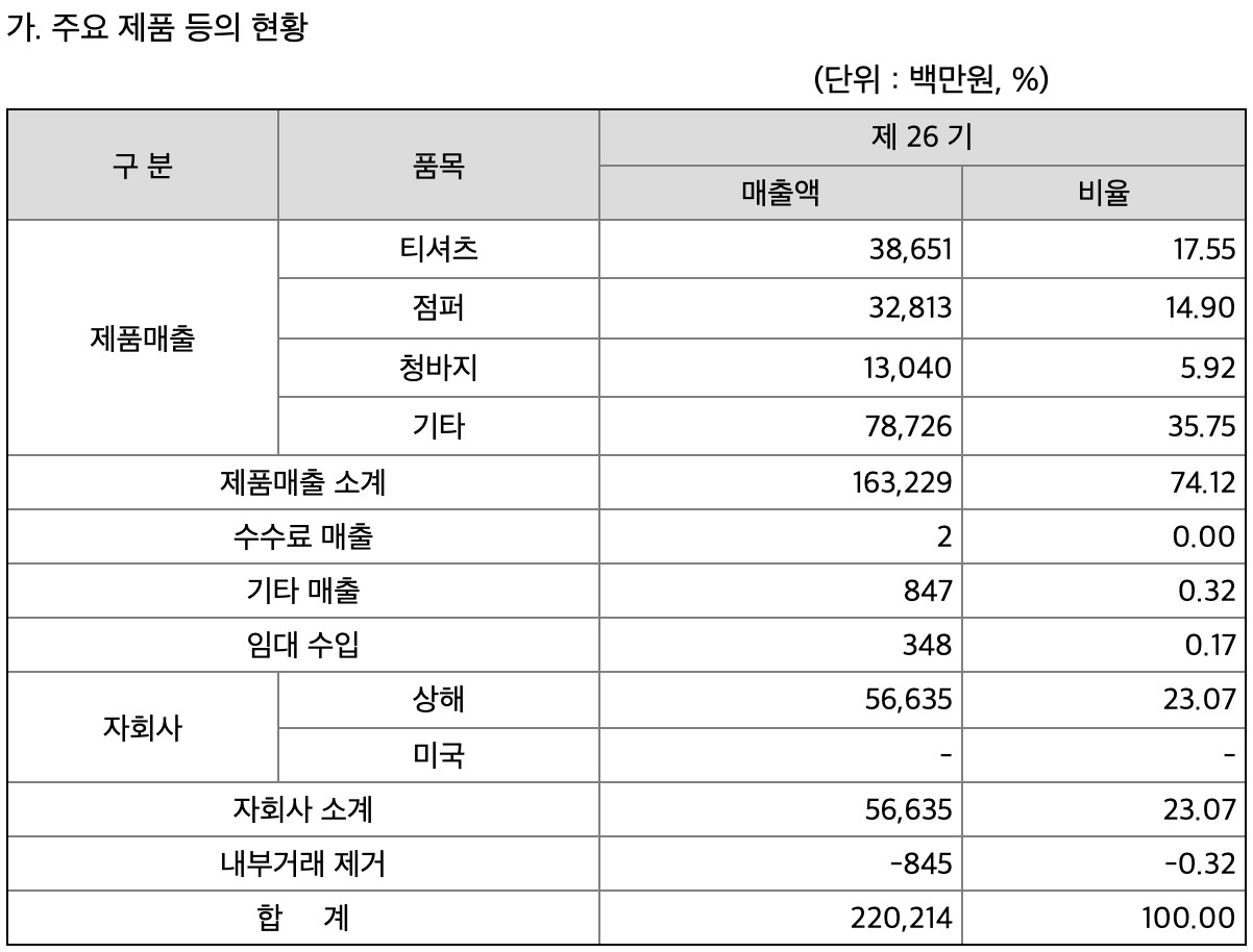 의류 브랜드로 의류제품 판매에서 75% 가량의 매출이 나오고, 상해에 있는 자회사에서 나머지 매출이 나오고 있습니다. 가지고 있는 브랜드들이 타겟 연령층에서 유행을 끄는 브랜드가 아니라서 기업 개요로 봤을 때는 매력적으로 보이지 않습니다.