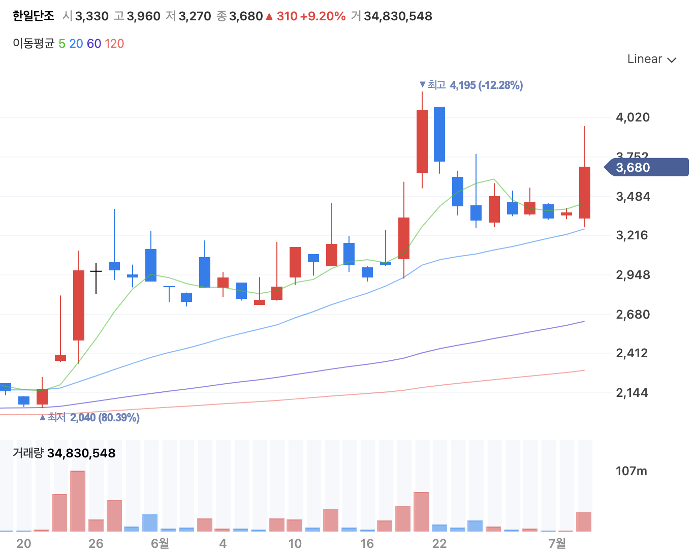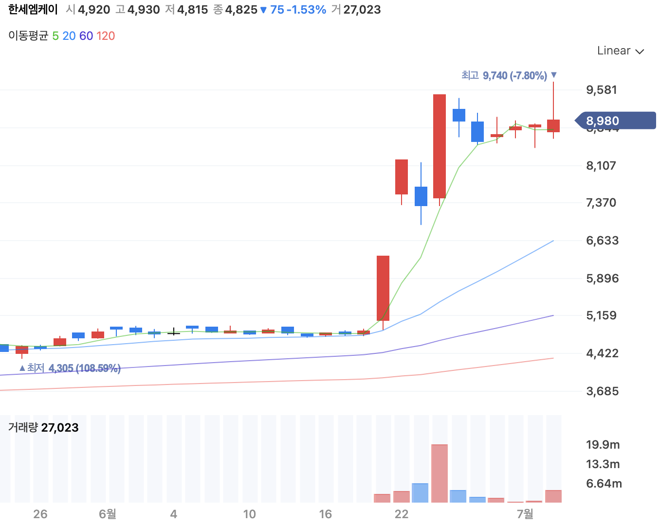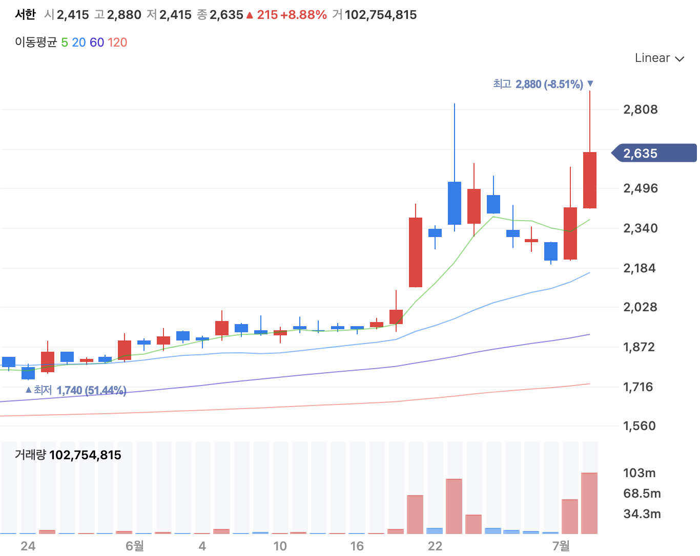 이전에는 거래량이 거의 없다가 6월 21일 이후로 터지면서 2배가량 올랐습니다.