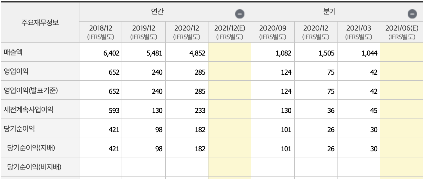 매출액은 2018년에 비해 크게 떨어졌지만 이후에는 매출, 영업이익, 당기순이익 등을 봤을 때 안정적으로 유지되고 있는 것 같습니다.