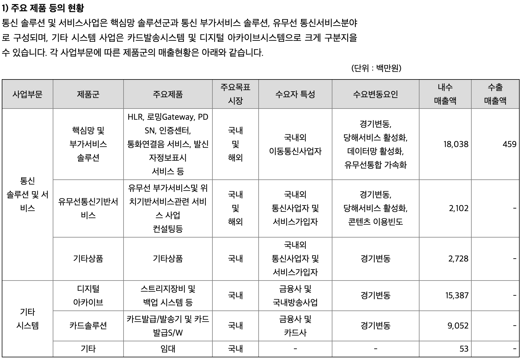 핵심망 및 부가서비스 솔루션, 디지털 아카이브 제품군에서 대부분의 매출이 발생하고 있습니다.