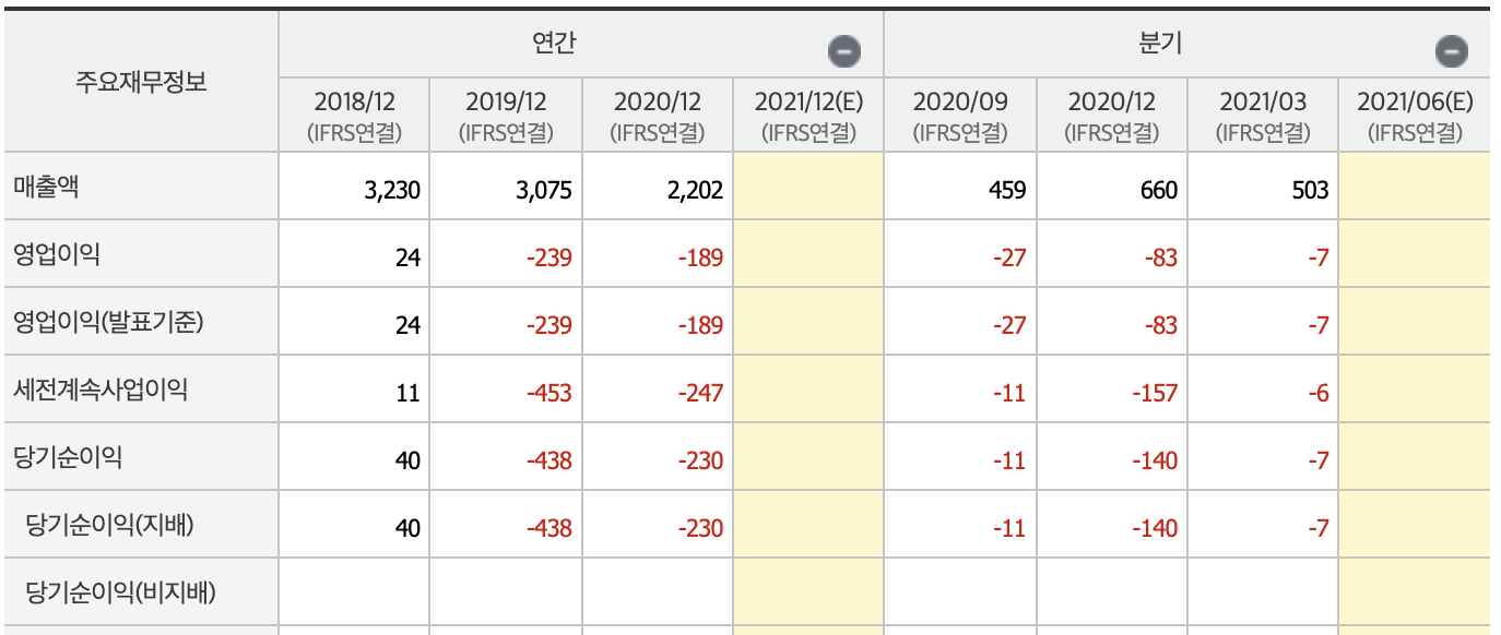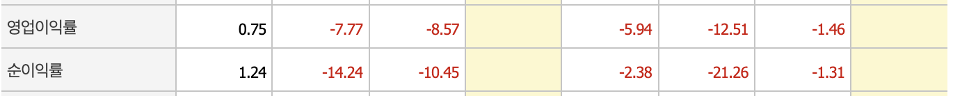 영업이익, 당기순이익, 영업이익률, 순이익률 모두 적자를 기록하고 있어서 매력적으로 보이지 않습니다.