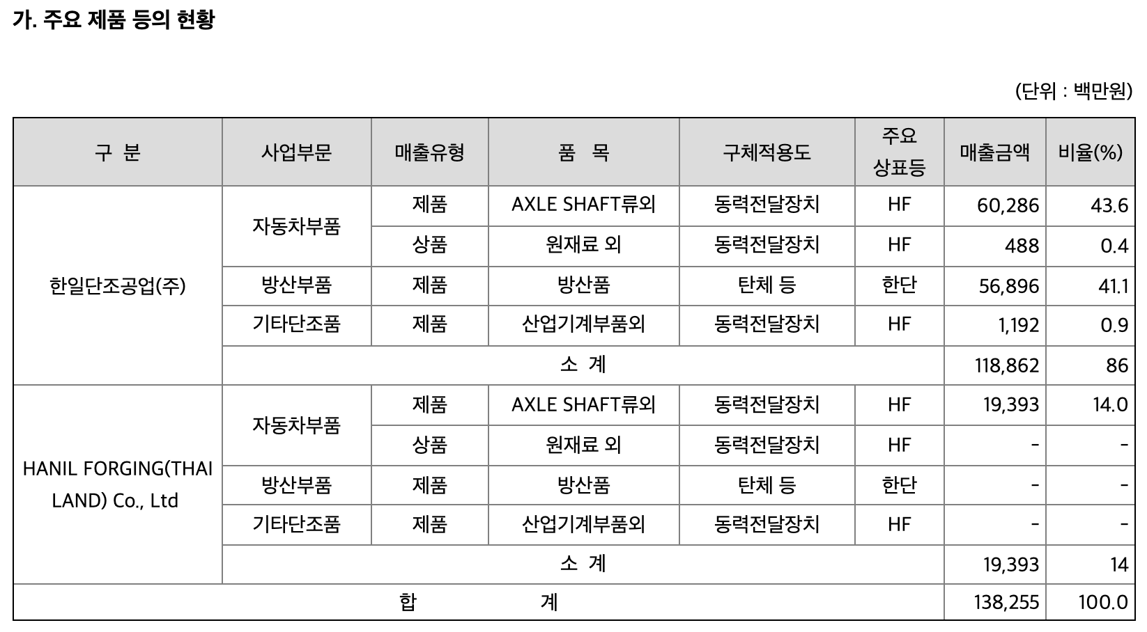첨단 정밀 자동차 부품인 AXLE SHAFT 및 SPINDLE류를 국내ㆍ외에 공급하고 있으며 또한, 방위산업분야의 유도탄 탄체, 탄두 및 중장비 부품ㆍ조선, 항공산업 부품 등을 생산ㆍ공급함.