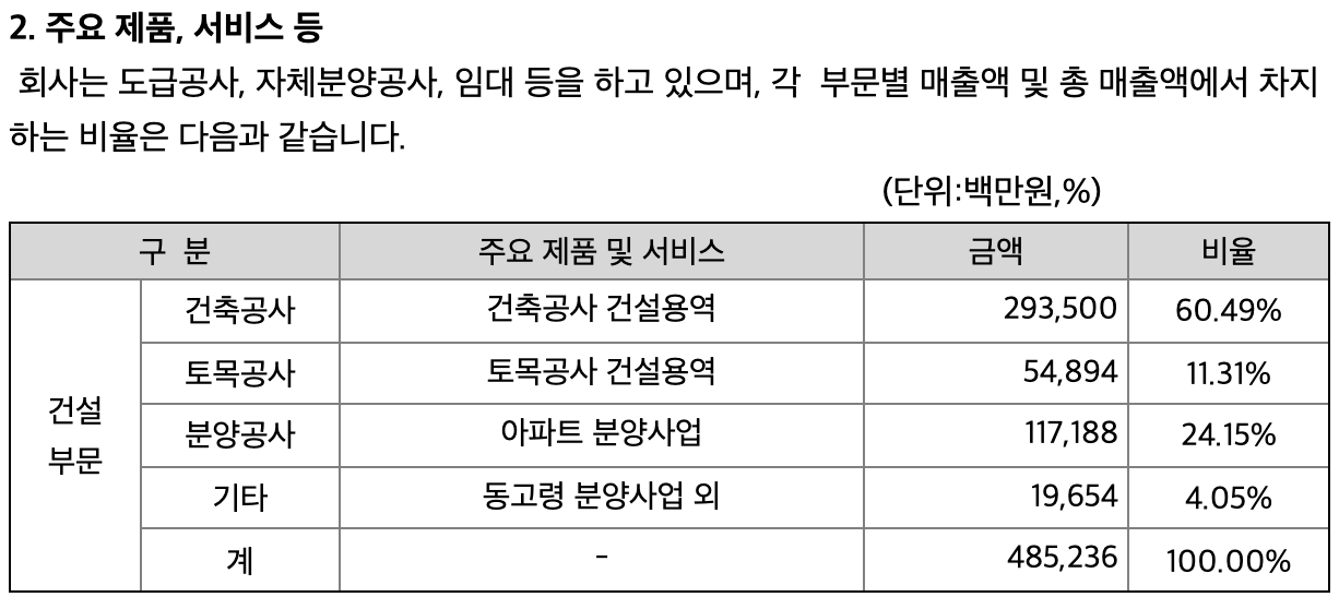 한국토지주택공사의 아파트 공사 및 국제과학비지니트 벨트 등의 대규모 관급 아파트 사업을 영위중임.