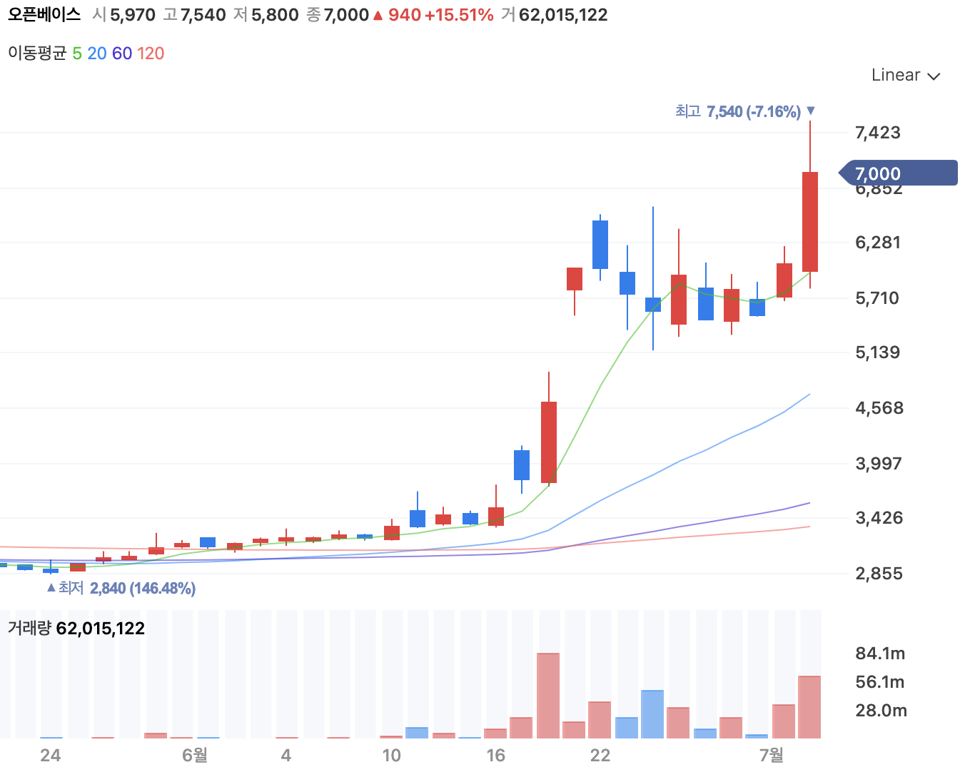 오픈베이스의 주가는 6월 18일에 거래량이 터지면서 크게 반등했습니다. 기존에 횡보하던 2000원대 후반 주가에서 최고 7540원까지 크게 올랐습니다. 이동평균선이 크게 벌어져 있어 현재 시점에서 투자는 매력적이지 않아 보입니다.