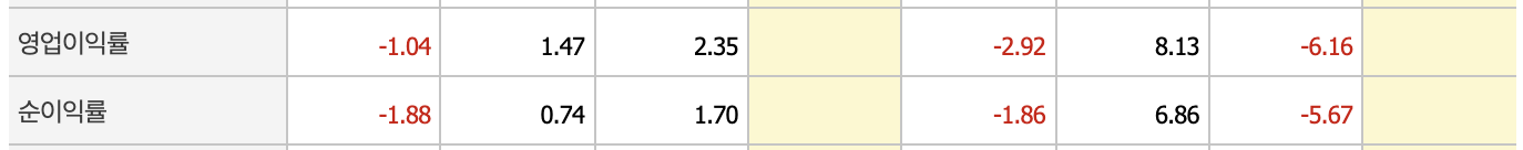 영업이익, 당기순이익, 영업이익률, 순이익률 모두 적자를 기록하고 있어서 매력적으로 보이지 않습니다.