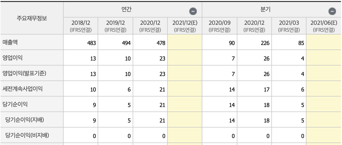 매출액은 2018년에 비해 크게 떨어졌지만 이후에는 매출, 영업이익, 당기순이익 등을 봤을 때 안정적으로 유지되고 있는 것 같습니다.