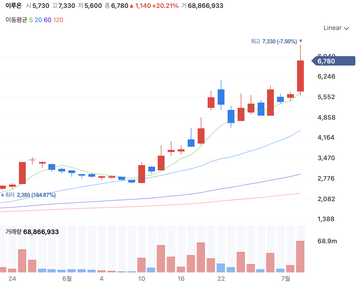 이전에는 거래량이 거의 없다가 6월 21일 이후로 터지면서 2배가량 올랐습니다.